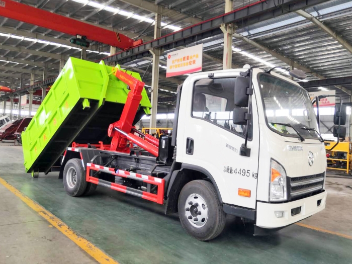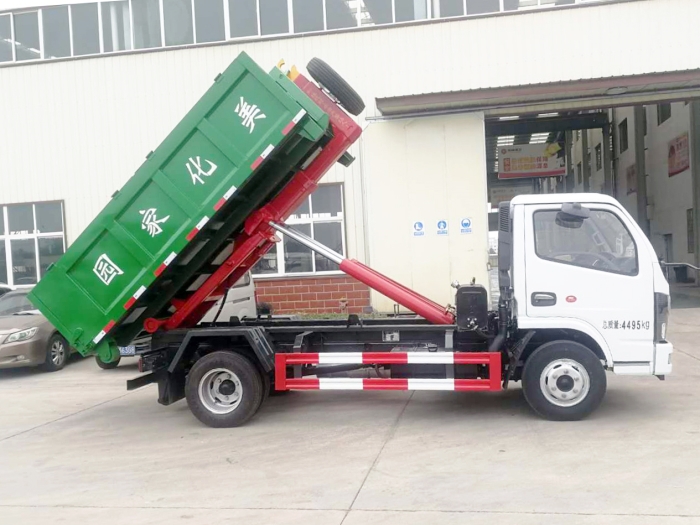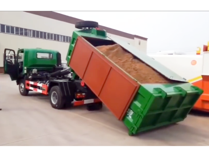 運(yùn)輸介質(zhì)為:建筑垃圾,主要是利用勾臂垃圾車(chē)底盤(pán)自帶的發(fā)動(dòng)機(jī)為動(dòng)力,通過(guò)變速箱上安裝的取力器,取力器處安裝油泵,采用液壓機(jī)構(gòu)手動(dòng)或電控來(lái)實(shí)現(xiàn)箱體的上鉤、下卸、自卸等功能。車(chē)輛的箱體采用優(yōu)質(zhì)炭鋼板全密封焊接結(jié)構(gòu),具有重量輕、不產(chǎn)生二次污染等優(yōu)點(diǎn)。